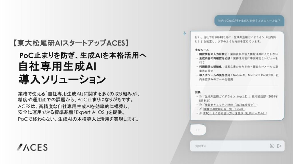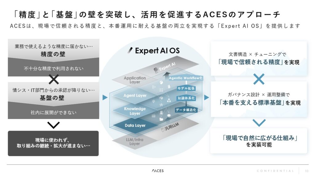 「自社専用生成AI」を構築し、PoC段階で止まりがちな「精度」と「基盤」の壁を突破するために、ACESは独自フレームワーク「Expert AI OS」を提唱しています。